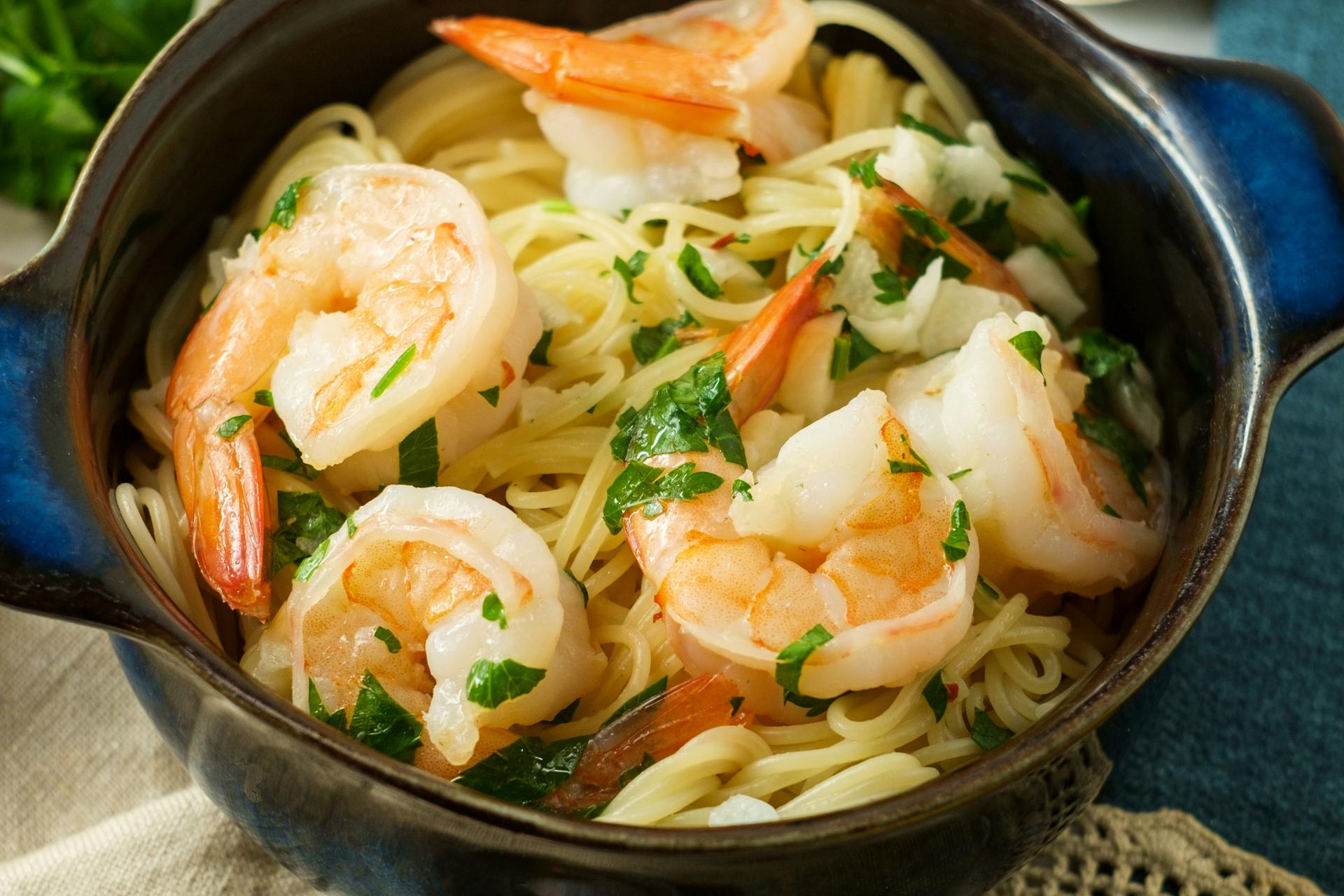 Noedels, krokant gebakken scampi en verschillende groenten, bereid in de wok en op smaak gebracht met Oosterse kruiden en specerijen.