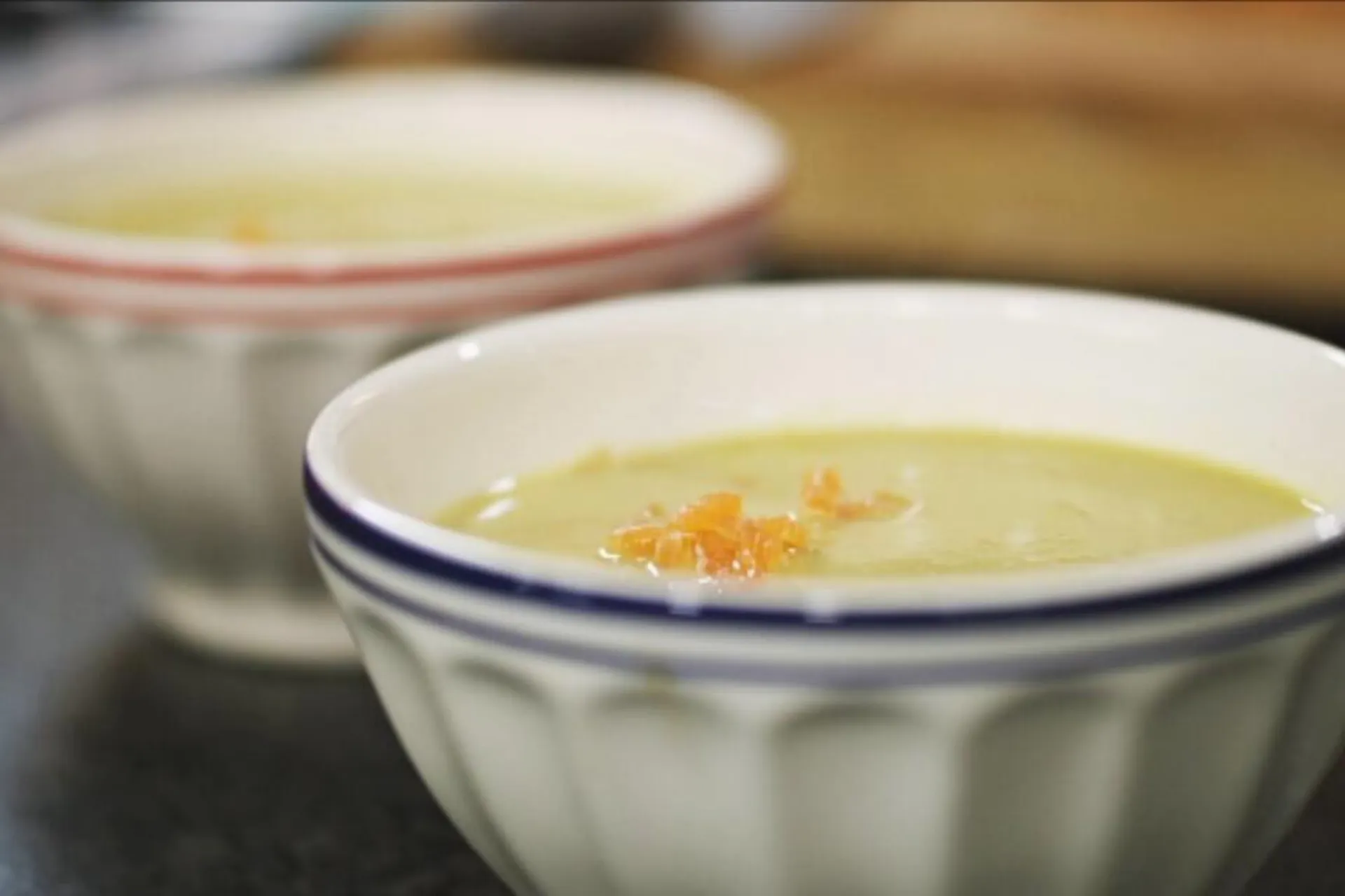 Een variatie op de witloofsoep met curry en gerookte zalm volgens Jeroen Meus. Het groenlof zorgt voor een tikkeltje subtiele bitterheid.