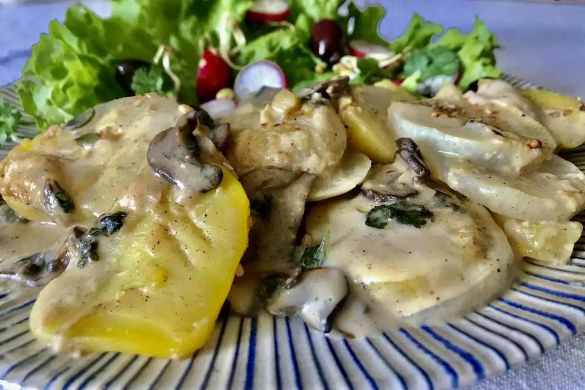 Een trio van raapjes, paddestoelen en aardappelen, overgoten met een kruidige kaassaus en gegaard in de oven.