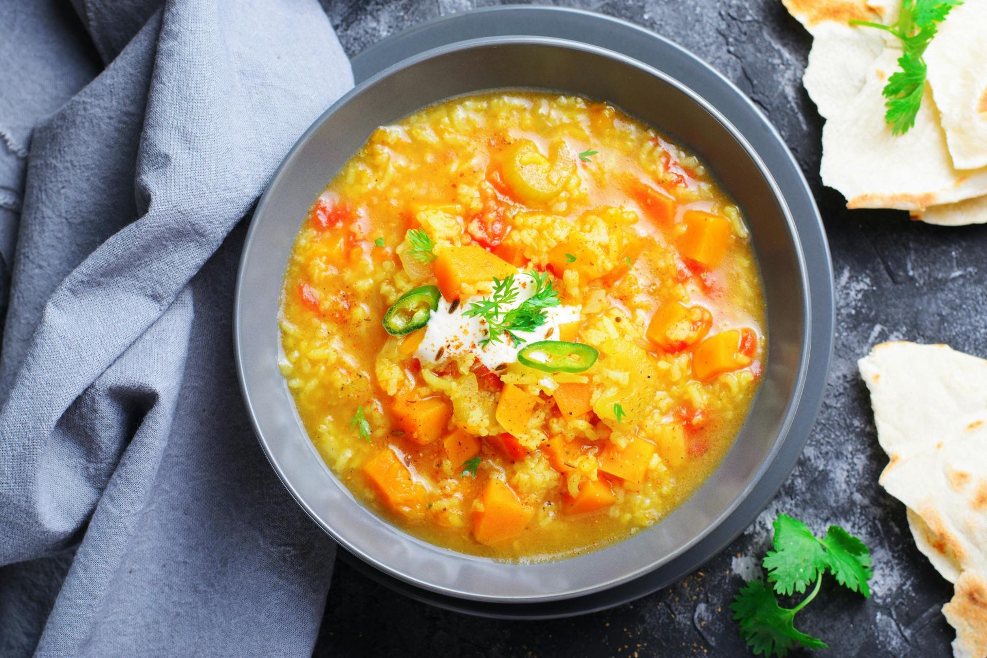 Smeuïg, kruidig en verwarmend, deze korma curry met wortel en pompoen is comfortfood in een kom. De zachte zoetheid van wortel en pompoen krijgt extra diepte door de romige kokosmelk en geurige korma-kruiden.