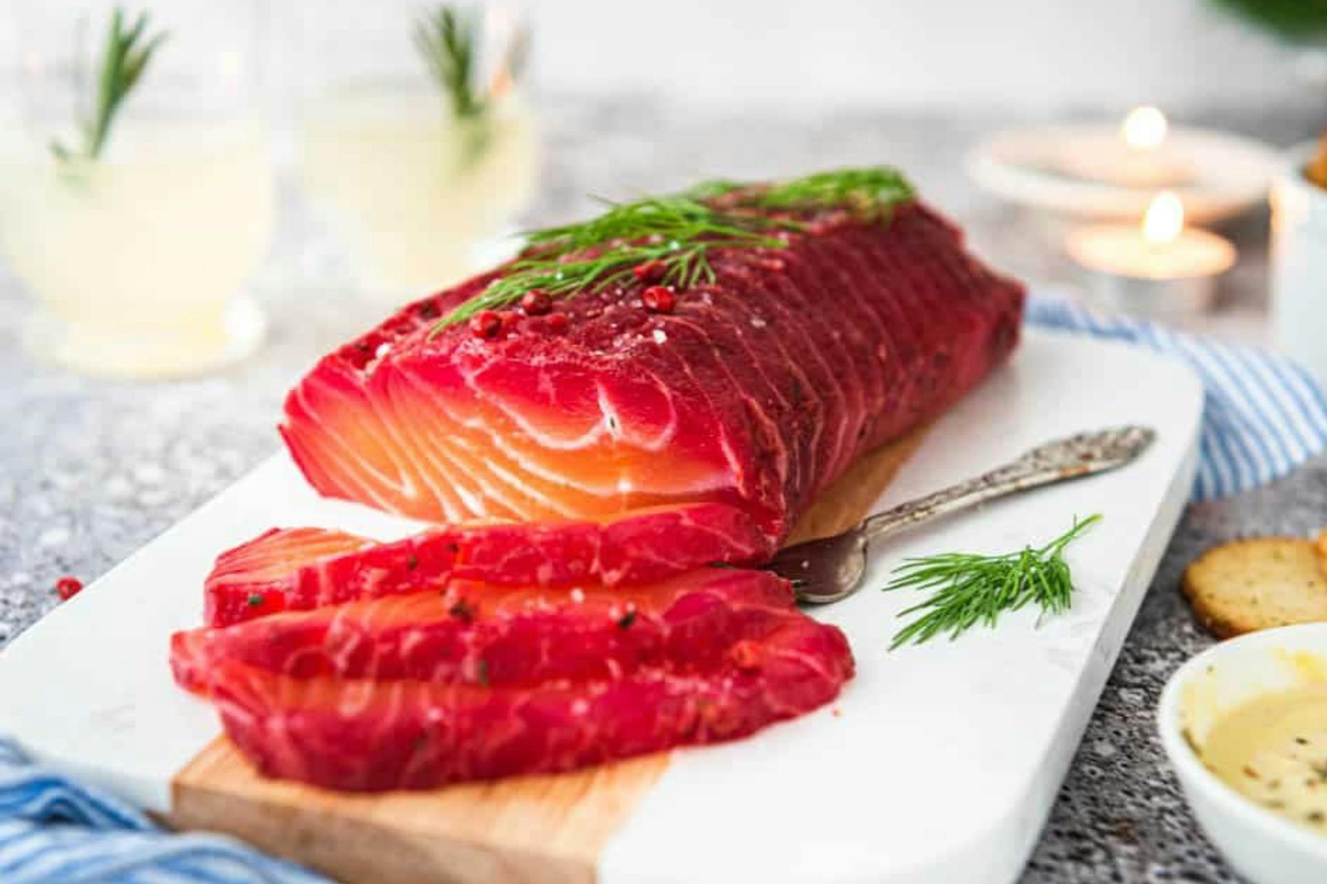 Een fris en kleurrijk voorgerecht dat prachtig oogt op je bord: deze gravad lax met rode biet combineert de zachte, rijke smaak van zalm met de aardse zoetheid van biet en een vleugje dille. Gravad lax is een Scandinavisch gerecht waarbij rauwe zalm wordt gemarineerd in een mengsel van zout, suiker en kruiden, meestal dille. Ideaal om vooraf te serveren bij een feestelijk diner of als speciale traktatie bij een brunch.