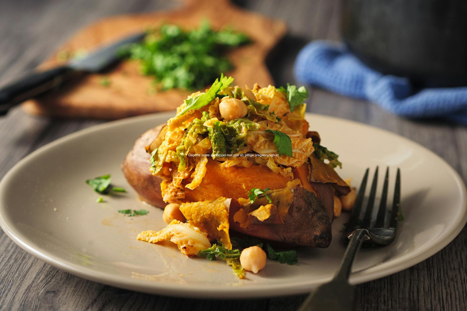Zoete aardappel met teriyaki-groenten: een gerecht dat comfort food en frisse smaken perfect combineert. zacht gepoft, gevuld met licht gebakken prei en savooikool met een subtiel pittige toets van chili, en afgewerkt met romige yoghurt en knapperige pompoenpitten. een kleurrijke bord vol texturen en smaken, ideaal voor een doordeweekse avond of een gezellige lunch.